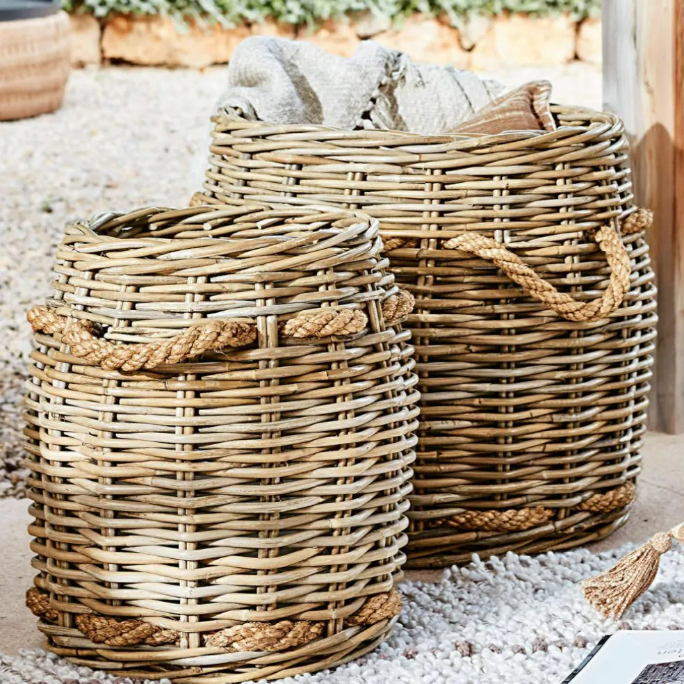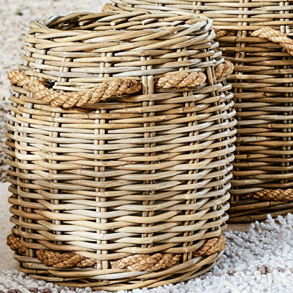 Jolis accessoires d’intérieur tendance et pratiques en même temps. Robustes, durables et résistants. Avec des poignées pratiques en corde de jute brute. Ces panières en rotin de forme élégante, disponibles en deux tailles différentes, ne sont pas seulement un bel accroche-regard dans votre intérieur, mais aussi des aides utiles pour votre quotidien. En effet, elles conviennent aussi bien pour transporter du bois de chauffage que pour ranger des magazines ou des serviettes usagées. Elles sont soigneusement tressées à la main et séduisent par leur grande solidité et leur durée de vie. Les éléments en corde de jute brute tressée apportent une note décorative et peuvent également être utilisés comme poignées.
