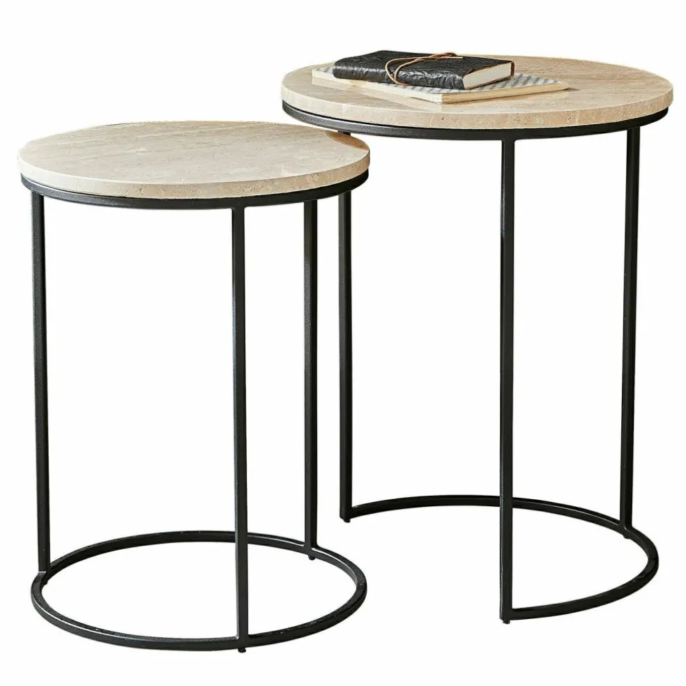Ce superbe lot de tables d’appoint offre une élégance intemporelle à chaque pièce. Uniques grâce à leurs couleurs et leurs motifs différents, les plateaux en travertin sont non seulement très jolis à regarder, mais aussi agréables à toucher. Le solide cadre en métal confère une stabilité et un aspect filigrané. Emboîtables, ces tables offrent non seulement une jolie surface de rangement, mais aussi une solution pratique pour un habitat peu encombrant. Laissez-vous séduire par la beauté naturelle et la polyvalence fonctionnelle de ce lot !
