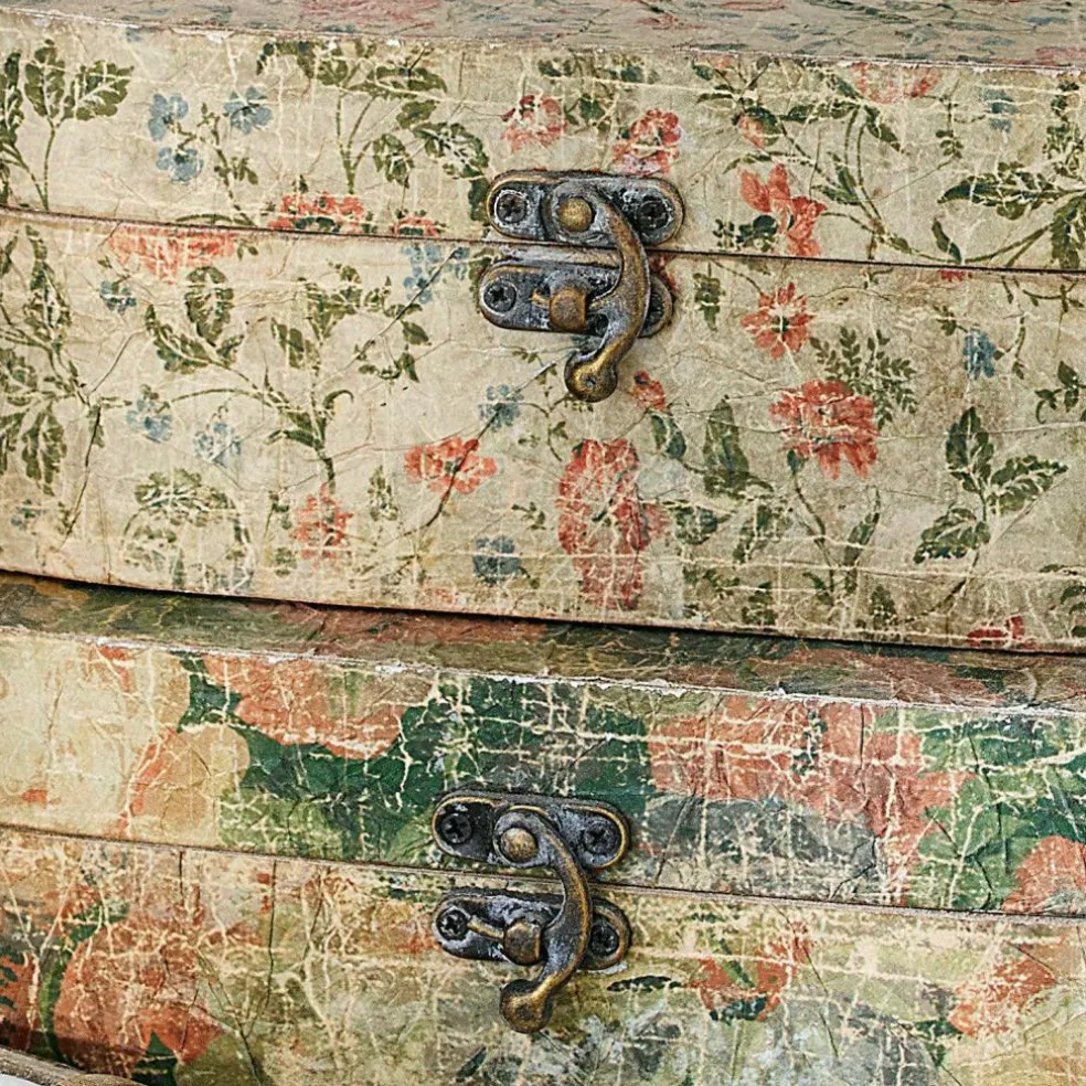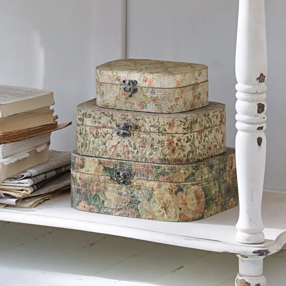 En bois et en papier revalorisé au sublime style vintage. Cet ensemble de boîtes séduit par son charme rétro. Ces trois boîtes, qui rappellent d’anciennes boîtes à bijoux, nous replongent dans une époque révolue. On aime leur look ancien et leurs détails minutieusement travaillés. Ces boîtes se ferment à l’aide d’un fermoir joliment travaillé. Placées debout ou couchées, elles sont aussi décoratives que fonctionnelles. Vous pourrez y ranger mille choses : lettres, photos, cahiers, bijoux ou petits souvenirs. Vos objets seront conservés de manière très esthétique. Les boîtes sont en bois de placage stratifié de qualité. La surface est en papier imprimé d’un charmant motif rétro. Le lot comprend trois tailles différentes. Présentées ensemble ou individuellement, ces boîtes seront toujours du plus bel effet. Elles s’harmonisent parfaitement avec le style shabby chic romantique, ainsi qu’avec les intérieurs d’inspiration ancienne. On dirait presque qu’elles ont été trouvées au grenier – le rêve de tous ceux qui aiment dénicher de vieux objets originaux.