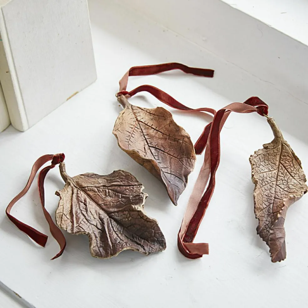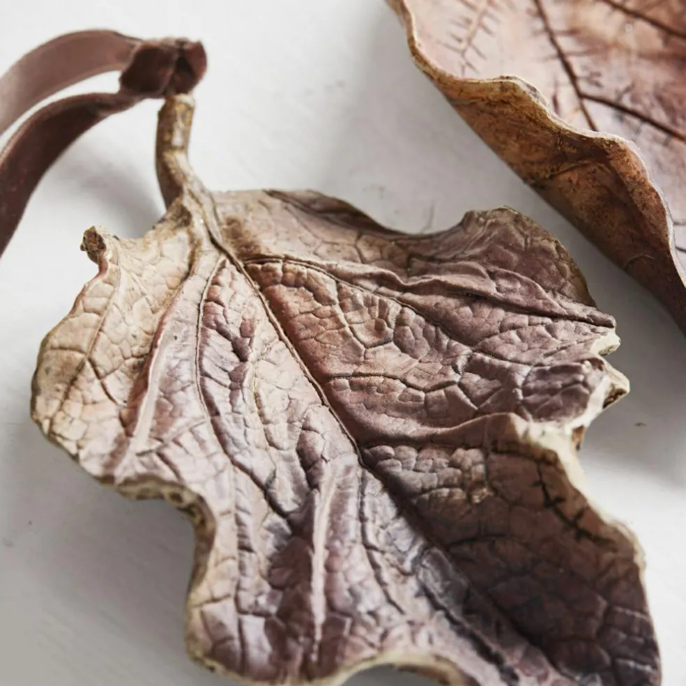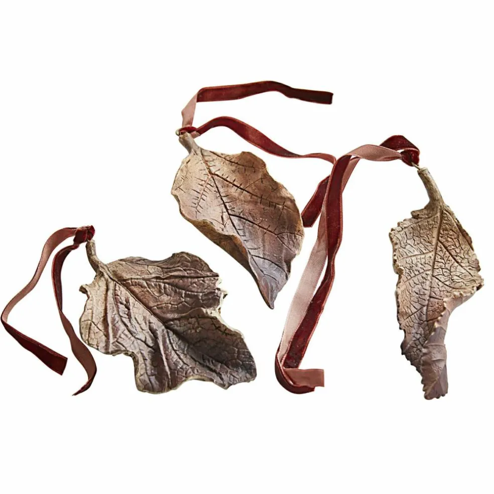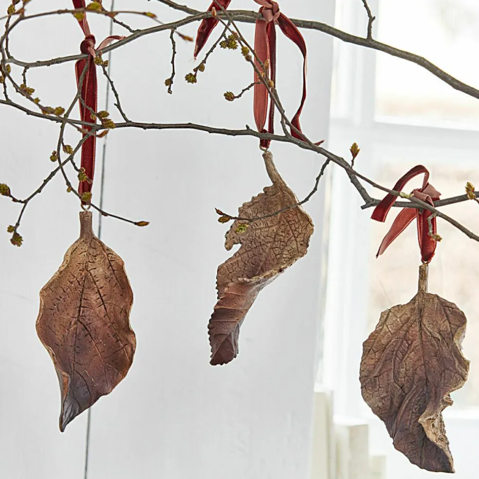 Ces superbes feuilles d’automne décoratives ressemblent à s’y méprendre à des vraies. Elles ont été réalisées avec grand soin en résine synthétique peinte à la main. Leur aspect naturel très authentique sera du plus bel effet dans un intérieur de style maison de campagne et fera entrer la nature dans votre maison. Le joli ruban en velours est inclus. En optant pour ce lot, vous profiterez de trois modèles parfaitement assortis que vous pourrez suspendre à une patère, à un crochet mural ou encore à un bouquet de branches que vous aurez vous-même assemblé. Des rameaux dans un vase feront également un merveilleux support.
