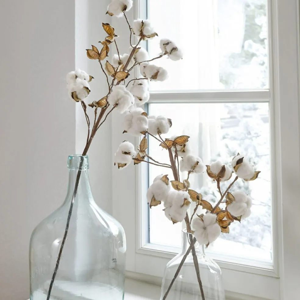 Ces trois superbes tiges ont l’air plus vrai que nature. Les fleurs de coton décoratives sont fidèlement reproduites et vous séduiront pour leur aspect naturel. Mieux encore : elles ne se fanent jamais et peuvent être réutilisées à l’infini ! Les fleurs synthétiques sont fixées à de véritables cosses de coton séchées. Leur stabilité est assurée par un fil de fer qui vous permet de disposer les tiges de manière individuelle. Ce lot de 3 s’intègre parfaitement dans un style champêtre et souffle un vent de nature dans votre maison. Disposez les tiges dans un joli vase , une jolie bouteille de vin peut aussi faire office de vase ? Laissez libre-cours à votre imagination ! Placées ensemble ou séparément, ces tiges embelliront votre intérieur. Dans la cuisine et la salle de bain, à côté du lit ou sur la table du salon, elles feront effet tout au long de l’année.