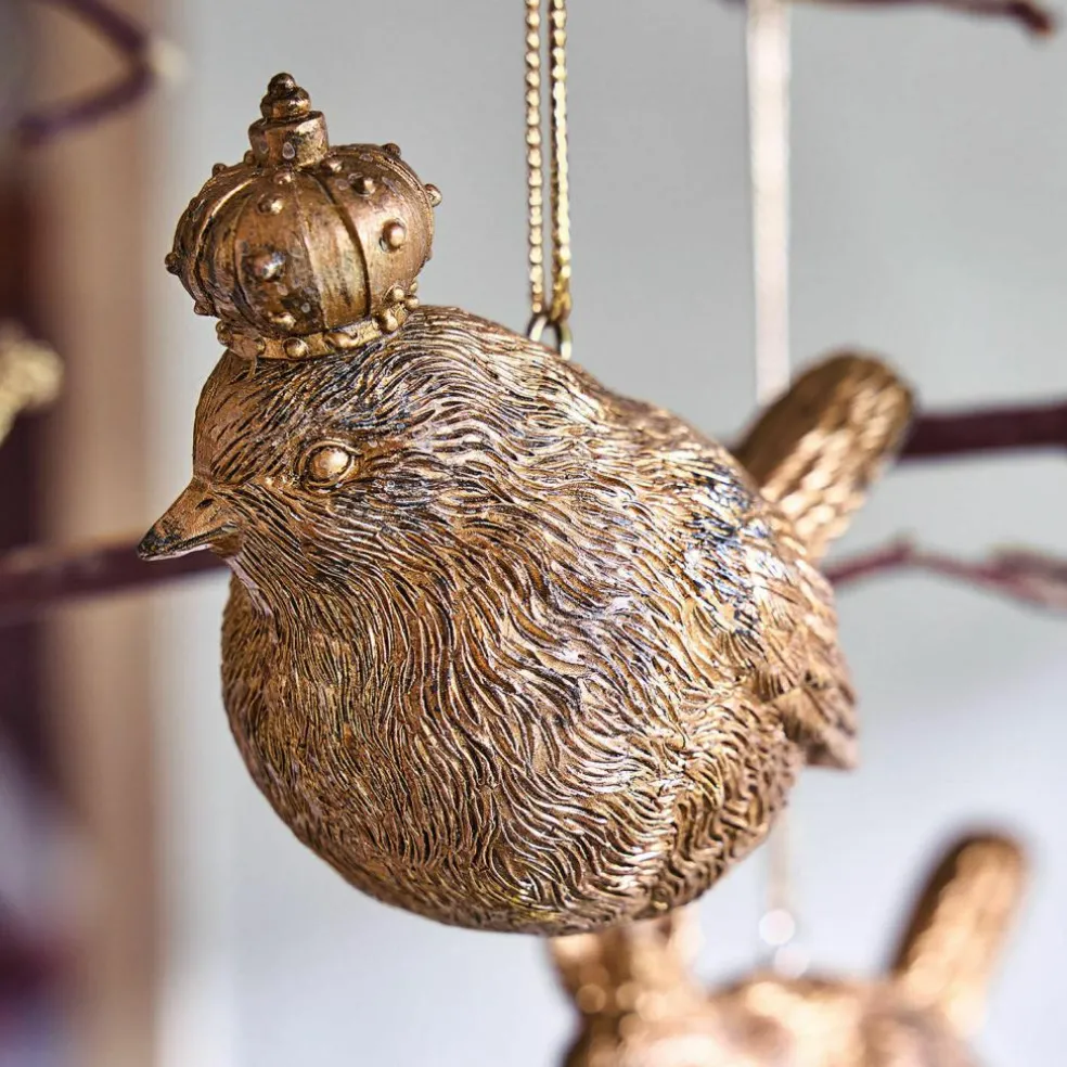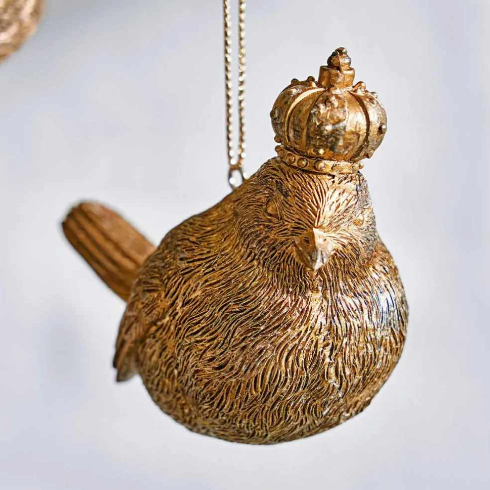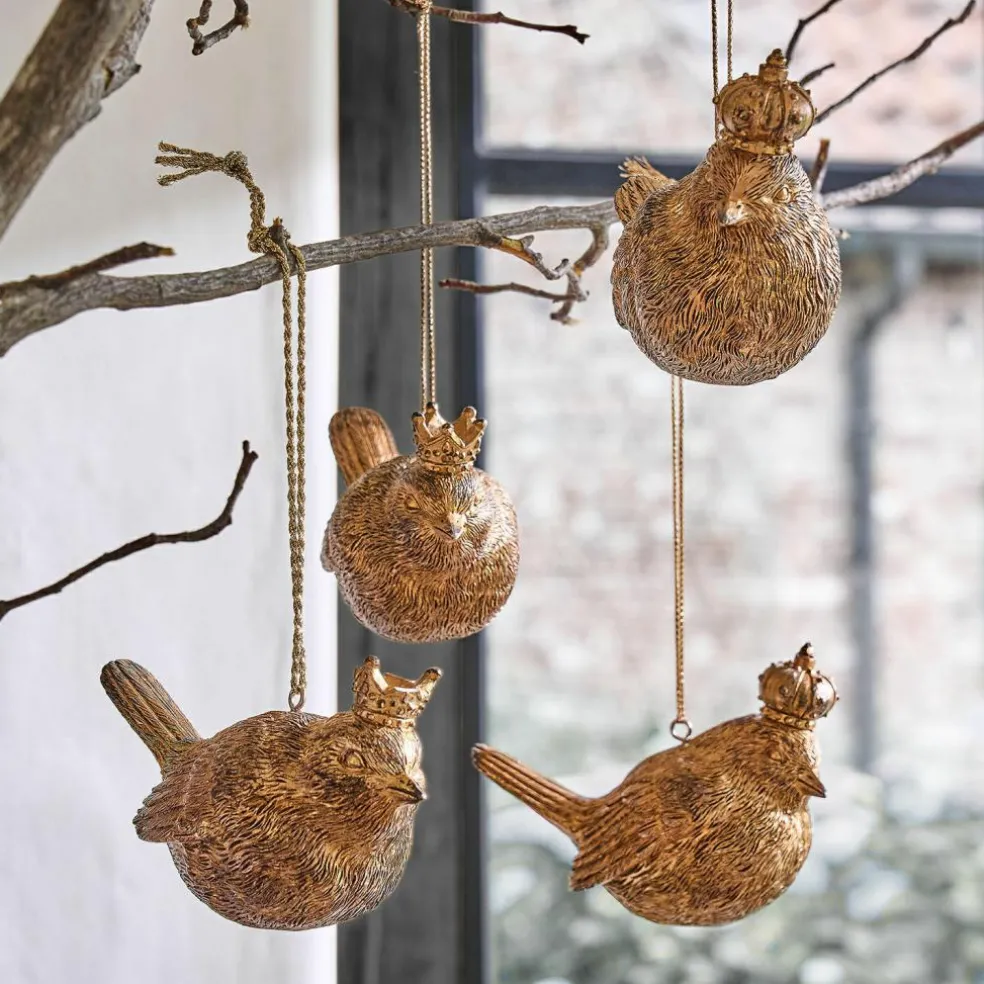 Ces quatre oiseaux dorés trônent comme des rois sur votre sapin de Noël, chacun avec une couronne détaillée sur la tête. Fabriqués en polyrésine et finis à l’or antique, ces pendentifs vous séduiront par leurs plumes finement modelées et leurs reflets mats. Ils ressemblent à de petits personnages de contes de fées victoriens et peuvent être mis en scène de façon merveilleuse : comme décoration sur une branche de sapin, comme accroche-regard sur une poignée de porte ou comme cadeau original. Leur matériau léger facilite leur accrochage – et leur effet est tout sauf ordinaire.
