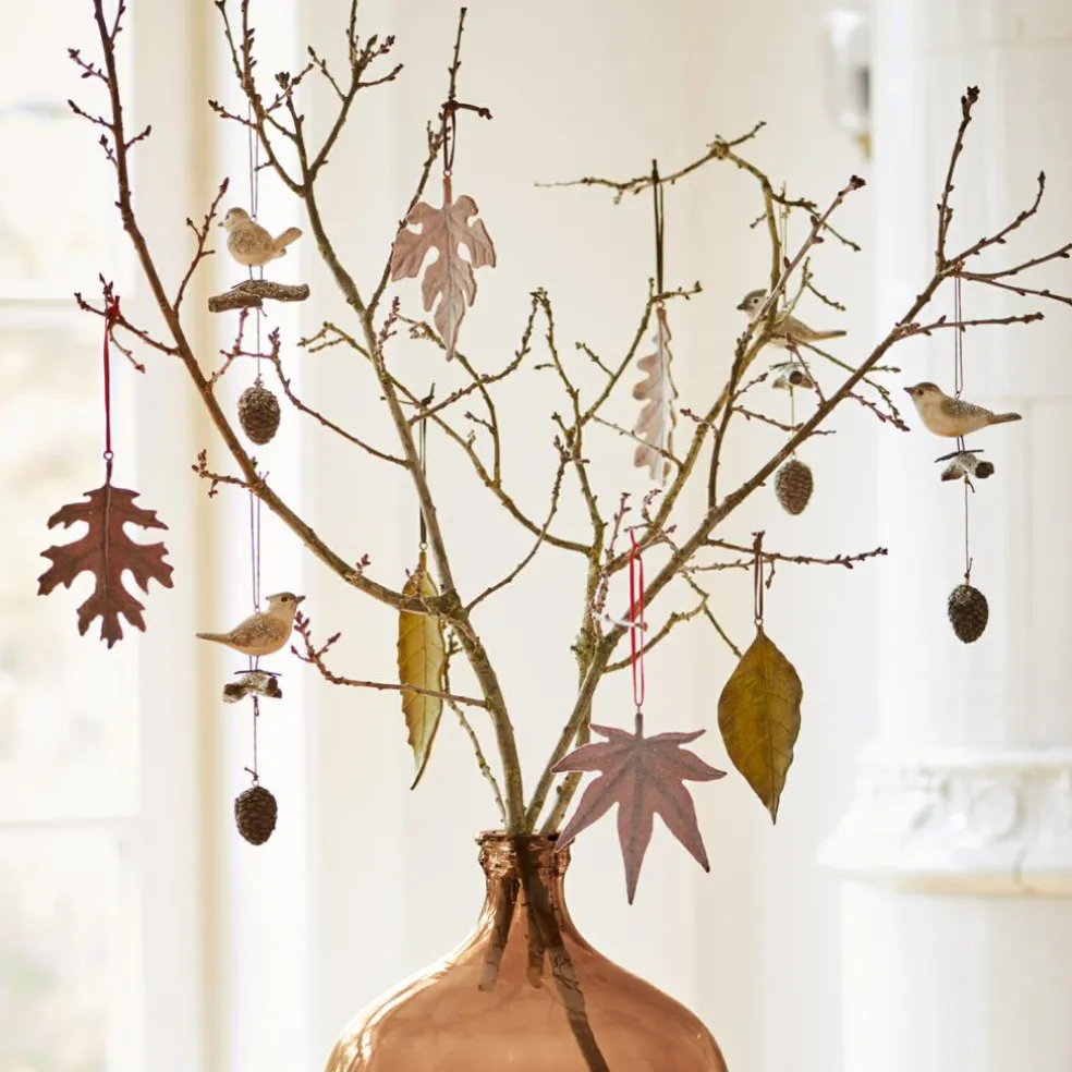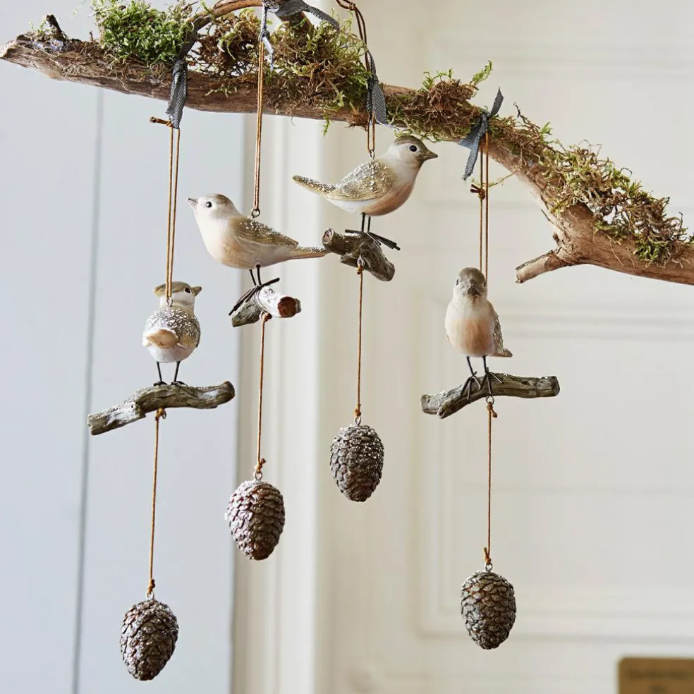 Bel ouvrage réalisé à la main. Peints à la main, effet légèrement brillant. Un adorable quatuor en polyrésine. Ils sont irrésistibles ! On dirait qu’ils viennent d’entrer par la fenêtre ! Ces moineaux très réalistes sont posés sur une branche décorative agrémentée d’une pomme de pin légèrement brillante accrochée par un lien en cuir. Les oiseaux peuvent être accrochés par un petit œillet en métal et par des liens en cuir. Une merveilleuse décoration au charme rustique.