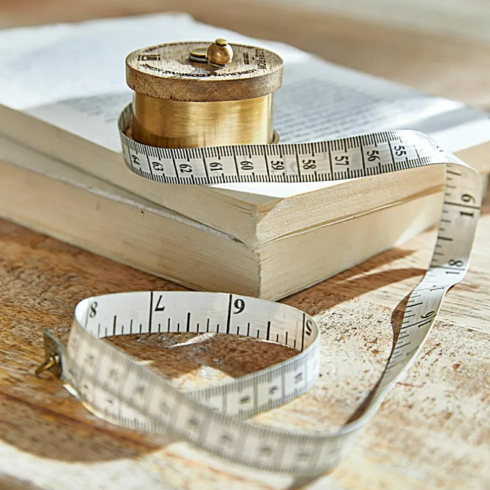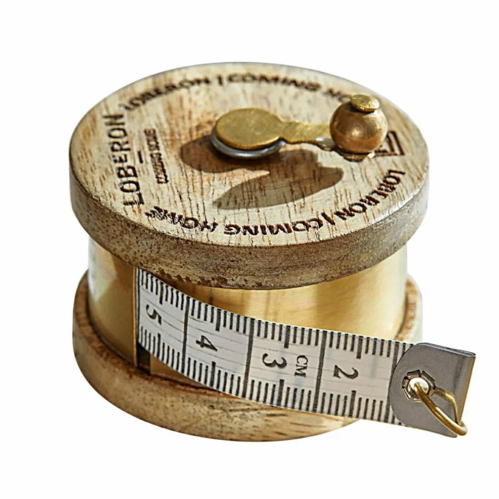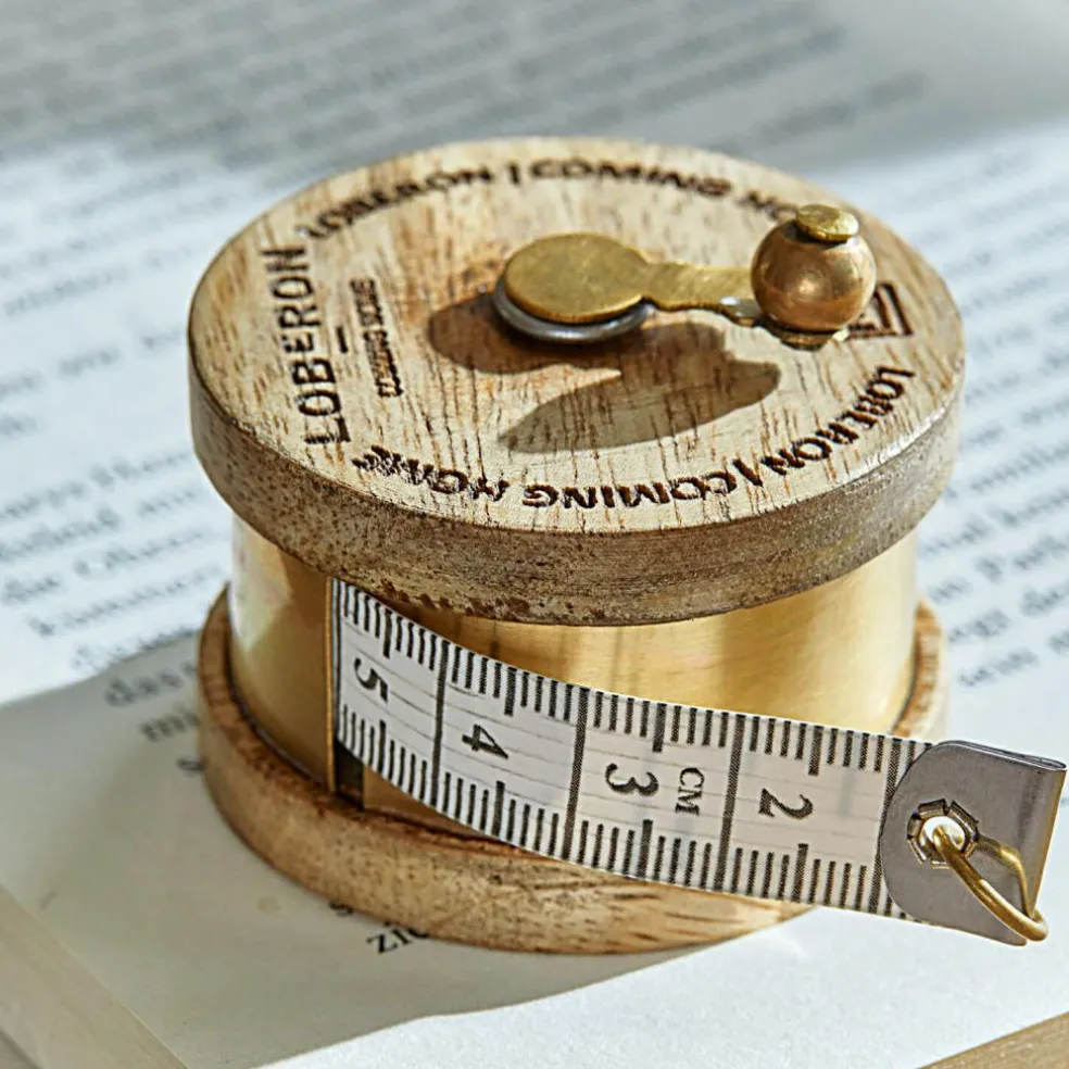 Quelle taille aura le pull que vous êtes justement en train de tricoter ? Quel format voulez-vous pour votre nouvelle housse de coussin ? Le cadeau que vous souhaitez faire livrer rentre-il dans la case des petits paquets ou est-il déjà un colis ? Voilà seulement trois situations du quotidien pour lesquelles vous aurez besoin de votre nouveau mètre-ruban. Certains objets peuvent être bien sûr mesurés à l’aide d’un mètre tout simple, mais lorsqu’il s’agit d’allier excellente fonctionnalité et superbe aspect, ce petit mètre-ruban gagne la comparaison haut la main. En particulier ce mètre-ruban là avec sa bobine rustique en bois de manguier et l’inscription de la marque LOBERON qui lui confèrent un style merveilleusement nostalgique et vintage. Nul doute que personne n’aura l’idée d’aller le cacher au fin fond d’un tiroir. Le boîtier et la petite manivelle sont en laiton de qualité supérieure, le mètre en lui-même est confectionné dans un nylon résistant.