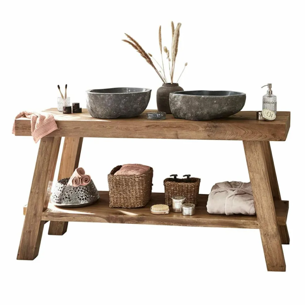 Commencer sa journée avec style et terminer sur une note relaxante le soir, c’est possible ! Pour cela, l’aménagement de votre salle de bains exige le même amour et le même soin que vous avez apporté aux autres pièces. Ce meuble double-vasque formera une base idéale pour votre spa personnel ! Car il s’agit à la fois d’un meuble fonctionnel, mais aussi d’un superbe point de mire qui célèbre la beauté de la nature et le savoir-faire artisanal traditionnel. Ce meuble double-vasque a été conçu en bois de teck haut de gamme et laissé au naturel pour mieux vous séduire avec son superbe veinage apparent. Les tablettes sous le meuble sont parfaites pour ranger serviettes et compagnie. Mais ce qui rend ce meuble si unique, ce sont surtout ses deux précieuses vasques en pierre naturelle authentique. Chaque pièce est absolument unique, ce qui confère au meuble un caractère aussi noble que luxueux. L’extérieur des vasques affiche une surface de pierre naturelle rustique tandis que l’intérieur est poli et parfaitement lisse pour faciliter leur nettoyage. Les vasques sont dotées d’ouvertures pour le siphon tandis que la table en teck doit encore être percée : c’est donc vous décidez de l’endroit précis où vous souhaitez poser les vasques.