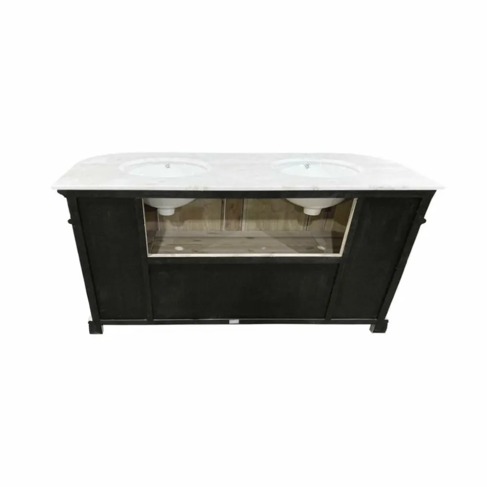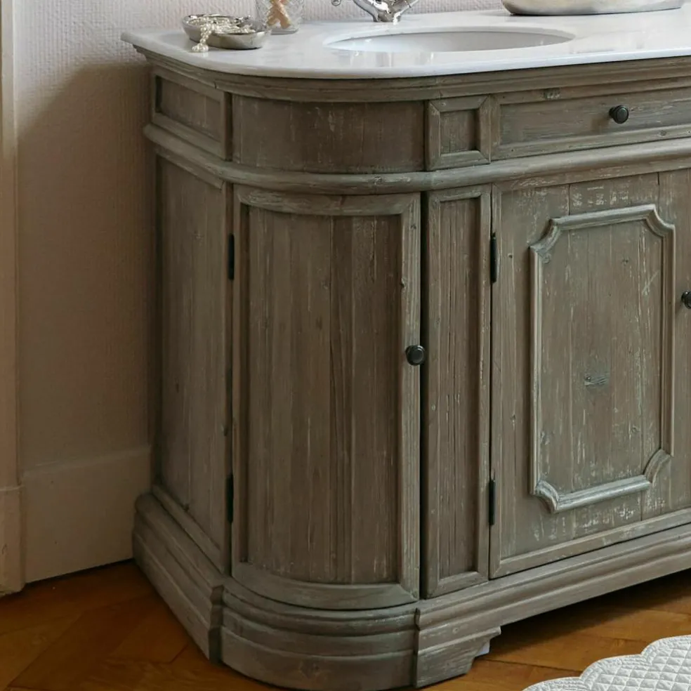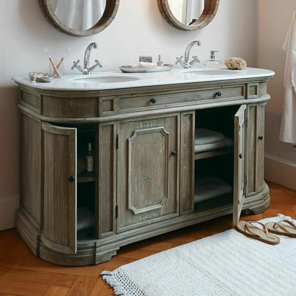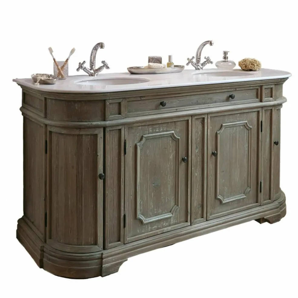 Ce plan vasque majestueux combine des matériaux naturels haut de gamme. Une magnifique plaque de pierre avec deux vasques surmonte un élégant meuble en bois de pin fabriqué à la main. Les portes arrondies sur les côtés, les éléments décoratifs raffinés complètent la noblesse à l’ancienne du modèle. Les quatre portes offrent un espace de rangement très important.
