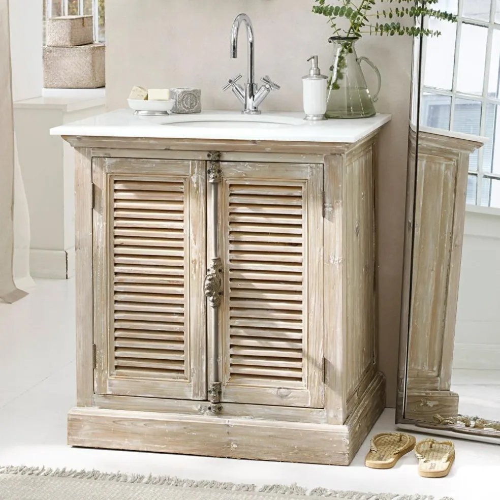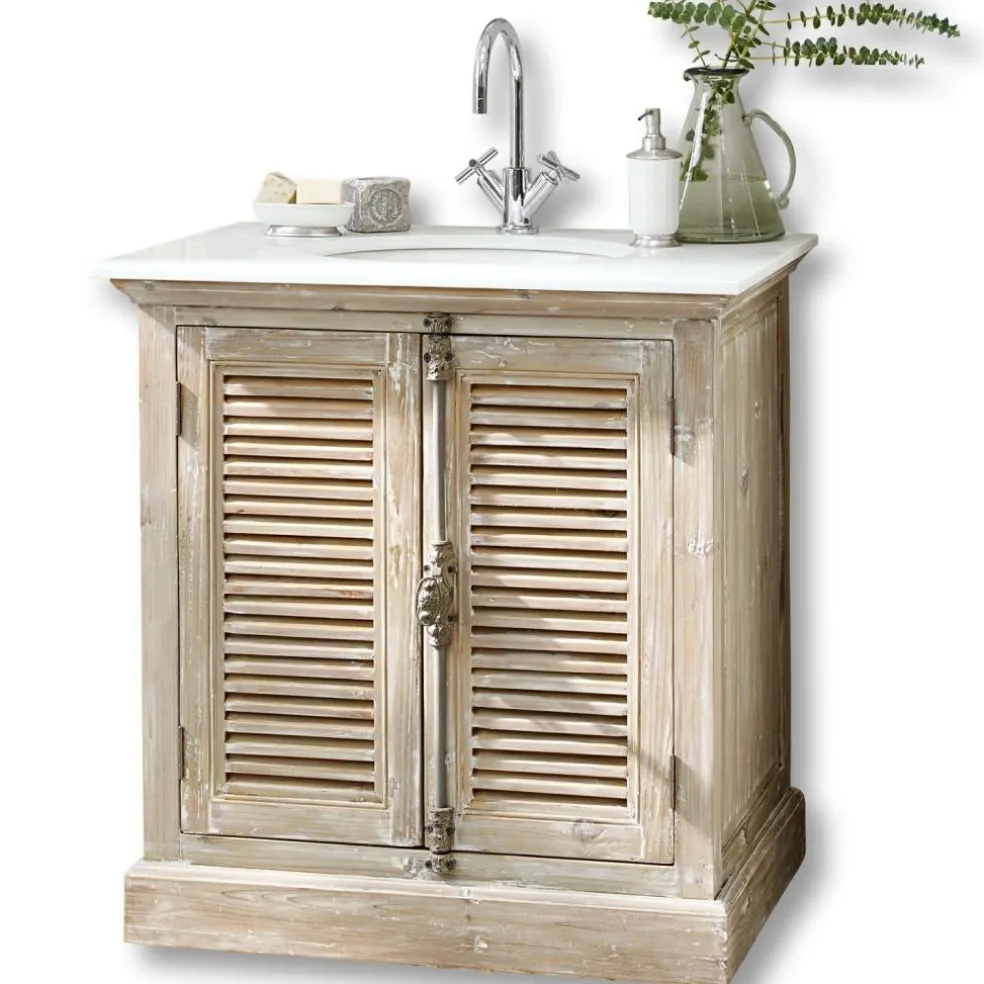 Avec ce superbe plan vasque, votre salle de bains volera la vedette aux autres pièces de la maison. Les matières travaillées avec habileté s’assemblent pour former un ensemble esthétique. Le caisson et les portes de cet incontournable des amateurs du style shabby chic sont confectionnées en véritable bois de sapin. La finition travaillée du bois ajoute une touche de charme vintage. La vasque en céramique est entourée d’un élégant plateau en marbre de grande qualité. Les merveilleuses portes à lames ajourées se ferment grâce à une fermeture à barreau ornée. À l’intérieur du meuble, vous pourrez ranger votre trousse de toilette, votre brosse, vos crèmes et vos lotions. Vous pouvez également stocker serviettes, gants, brosses à dents et sèche-cheveux derrière ces jolies portes. Votre salle de bains restera bien rangée et agréable. L’aspect harmonieux du meuble sera une pièce maîtresse dans la création d’une salle de bains à l’ambiance sereine. La tablette amovible vous permet de ranger de plus grands objets dans le meuble. Une surface de rangement spacieuse, qui saura vous convaincre par sa fonctionnalité comme par son aspect.