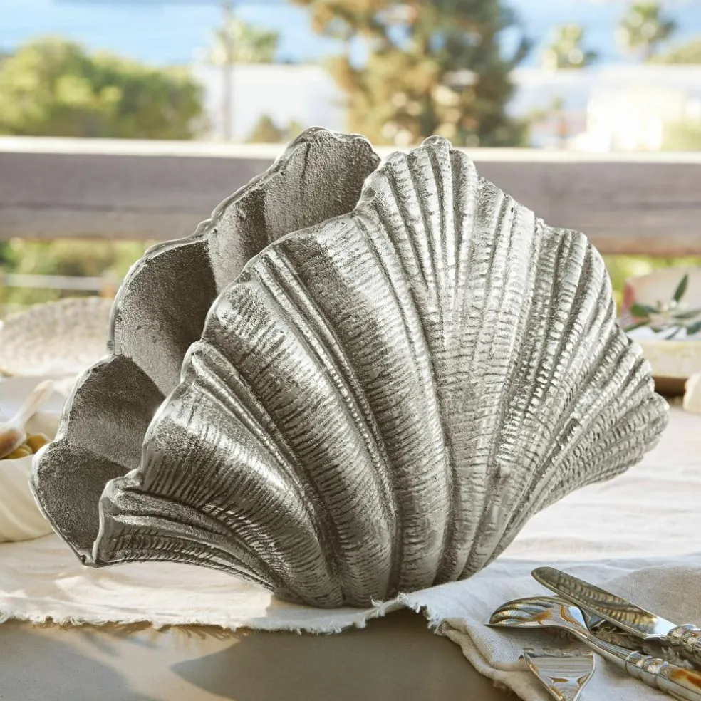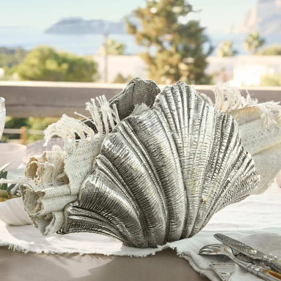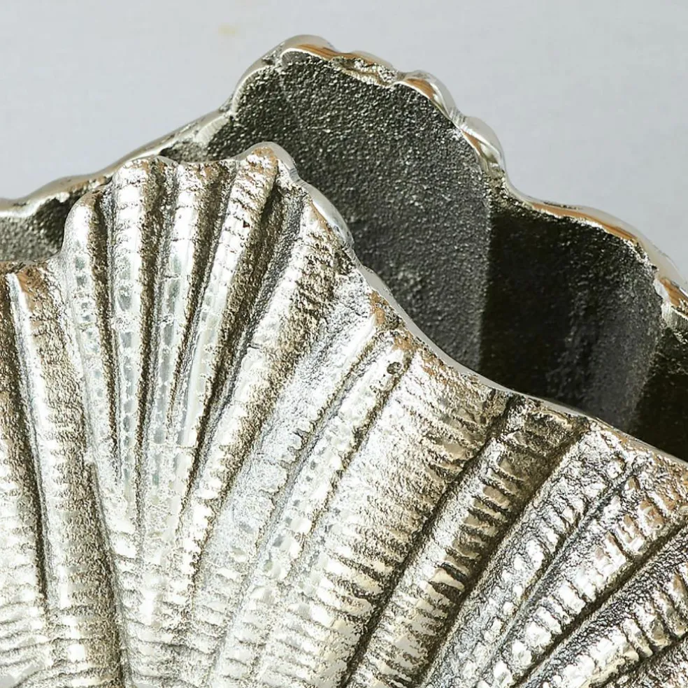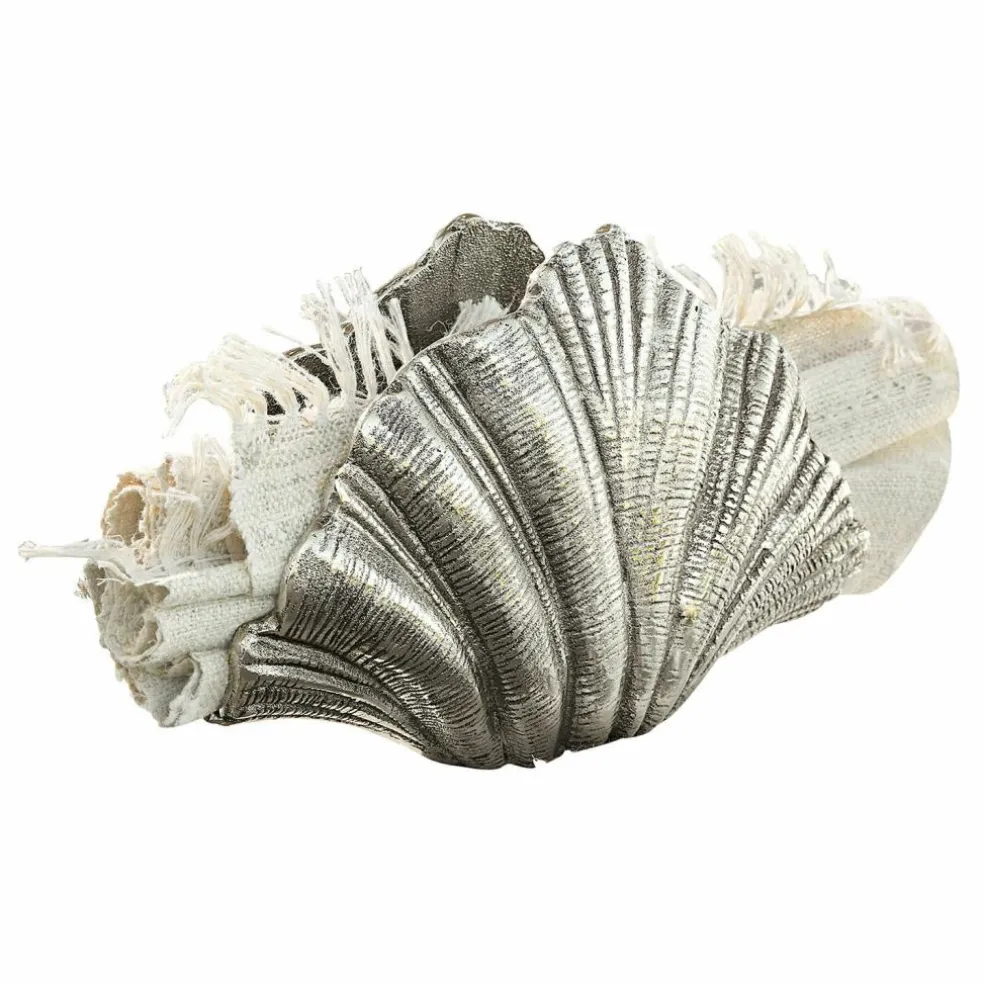 Les jeux d’ombre et de lumière sur sa surface finement travaillée font de cet objet décoratif un véritable point de mire. Sa forme sculpturale évoque un coquillage naturel, tandis que sa finition argent antique lui confère une patine subtilement vieillie, empreinte de caractère. Posé sur une console en élément central, utilisé comme support raffiné pour de petits accessoires ou intégré à une décoration de table maritime, il apporte une touche d’élégance singulière. Son matériau massif garantit une parfaite stabilité, tandis que ses lignes courbes créent un équilibre harmonieux et raffiné.