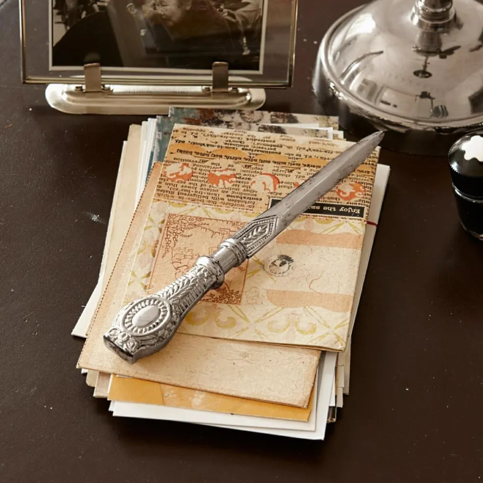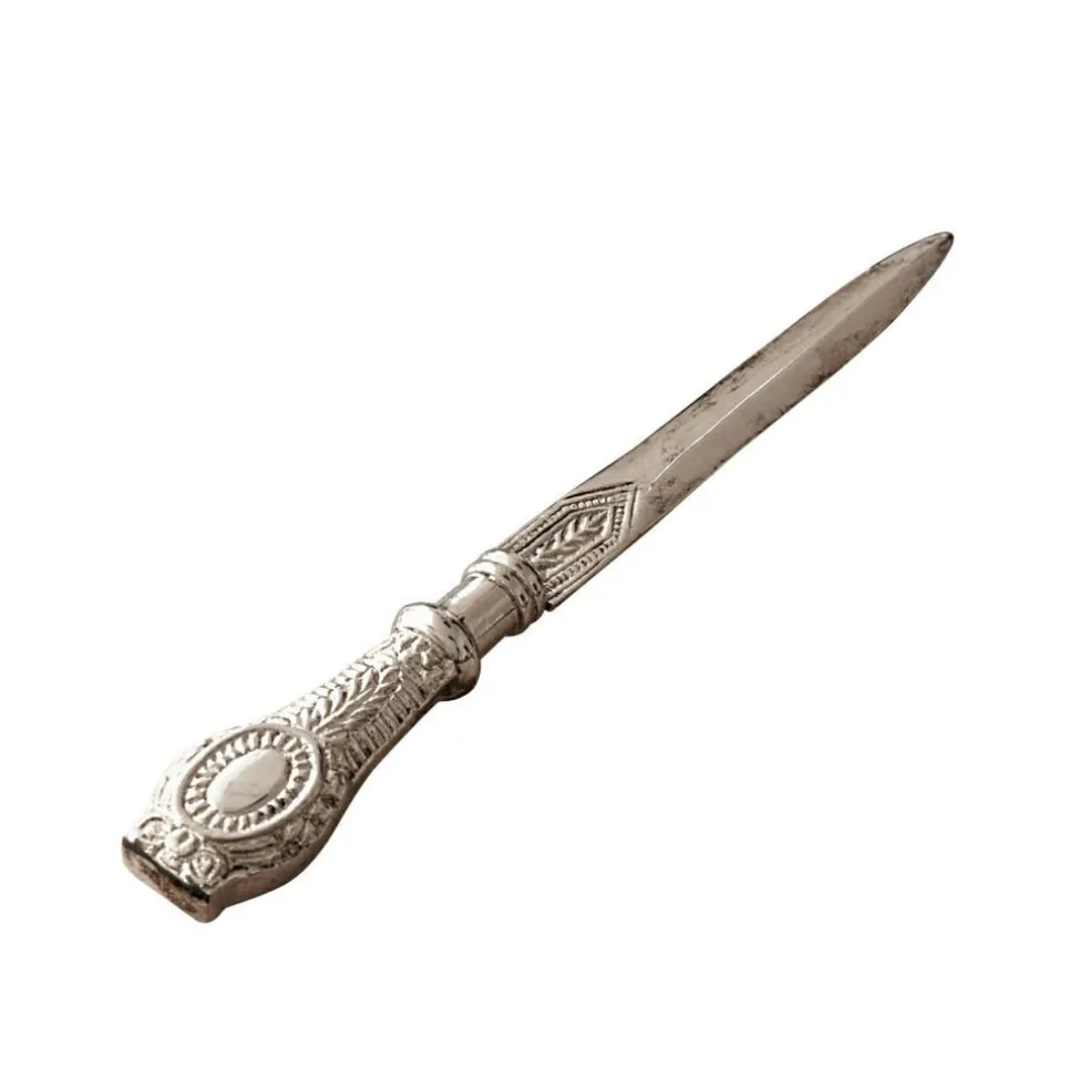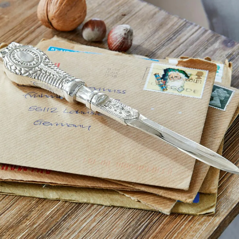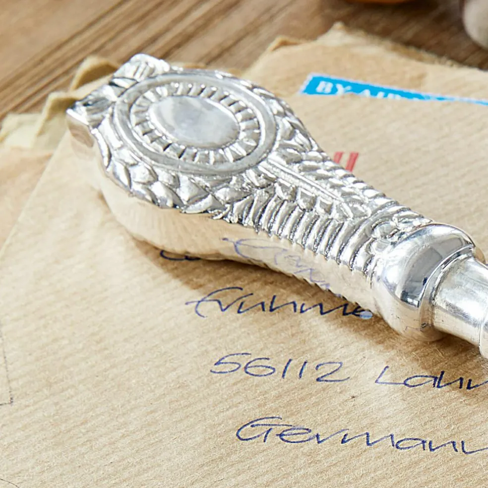 Un accessoire stylé pour le bureau : en laiton de style ancien, avec un manche décoré. Voilà bien longtemps que les ouvre-lettres ne représentent plus un signe de luxe excessif. L’ouvre-lettre est aujourd’hui un accessoire pratique pour traiter sa correspondance, qui vous évite d’abîmer le contenu de votre courrier quand vous l’ouvrez. Pourquoi donc se priver du plaisir d’utiliser cet accessoire pratique au bureau ? Par ailleurs, ce modèle est non seulement pratique mais aussi décoratif: absolument indispensable!