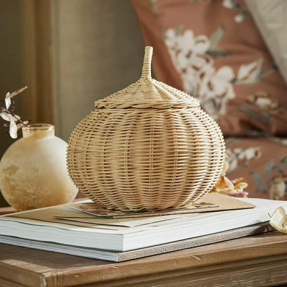Intégré à l’atmosphère douce d’un intérieur au style travaillé, ce panier en rotin en forme de citrouille raconte des histoires de pays lointains et d’artisanat traditionnel. Le motif tressé à la main et la forme doucement galbée reflètent la précision et la patience contenues dans chaque nœud. Sa couleur naturelle dégage une impression de détente et de bien-être, qui se fondra parfaitement dans votre décoration. Chaque effleurement révèle la structure à la fois solide et délicate du rotin et fait de ce panier un véritable trésor parmi votre collection d’accessoires d’intérieur. Ce n’est pas seulement un contenant pratique, mais aussi l’expression d’une individualité et de la valeur accordée à l’artisanat.