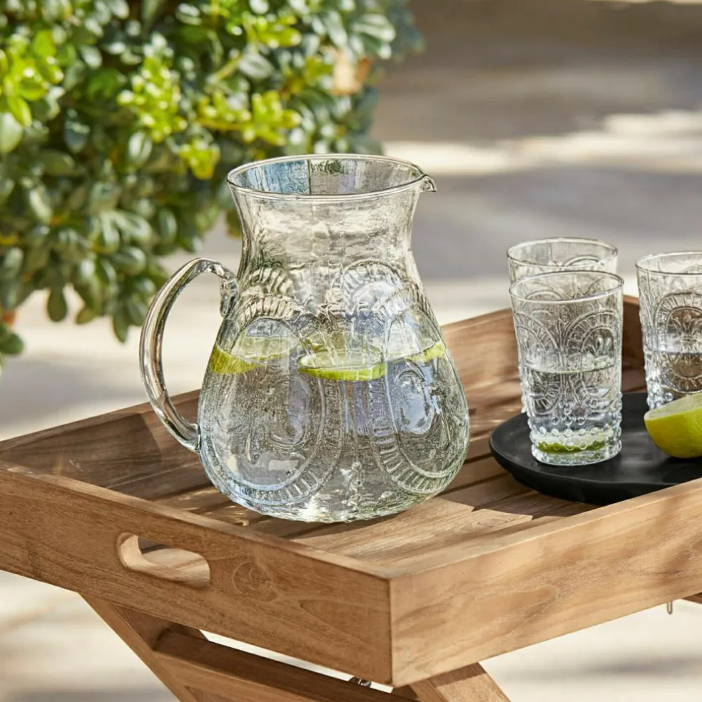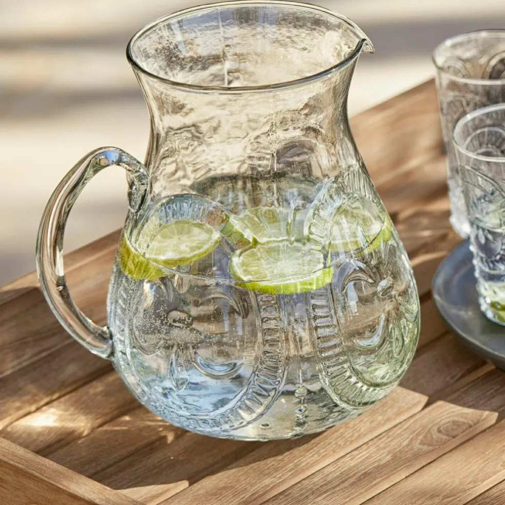 Élégante gravure motif lys. En verre transparent. Style résolument vintage. Cet accessoire très chic sera du plus bel effet sur votre table estivale et accompagnera les moments de détente en plein air, par exemple sur la table du balcon. Ce ravissant pichet sera parfait pour servir de l’eau fraîche garnie de rondelles de citron ou une délicieuse limonade. Il est toujours agréable d’avoir une boisson à portée de la main par temps chaud. Ce beau pichet séduit également par son élégance.
