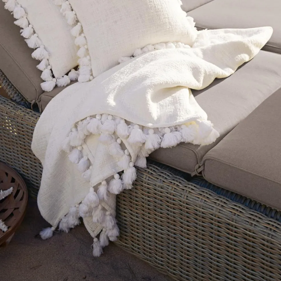 Style et confort tout au long de l’année. En tissu haut de gamme en coton : léger, respectueux de la peau et très agréable à toucher. S’intègre à tous les styles de décorations d’intérieur. Ce plaid en tissu de coton haut de gamme vous accompagnera à chaque saison : sa matière naturelle est rafraîchissante ou bien chaude selon la température, assurant ainsi un climat de bien-être constant. La couverture est également très légère, douce et très agréable même pour les peaux sensibles. De petites franges à pompons aux extrémités apportent une touche décorative. Un accessoire pour toutes les situations et tous les styles d’intérieur : moderne, classique ou encore rustique.