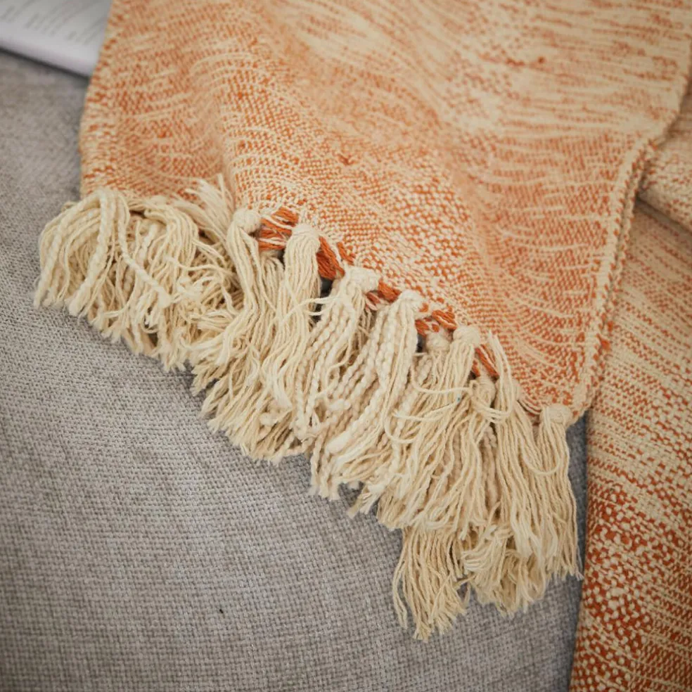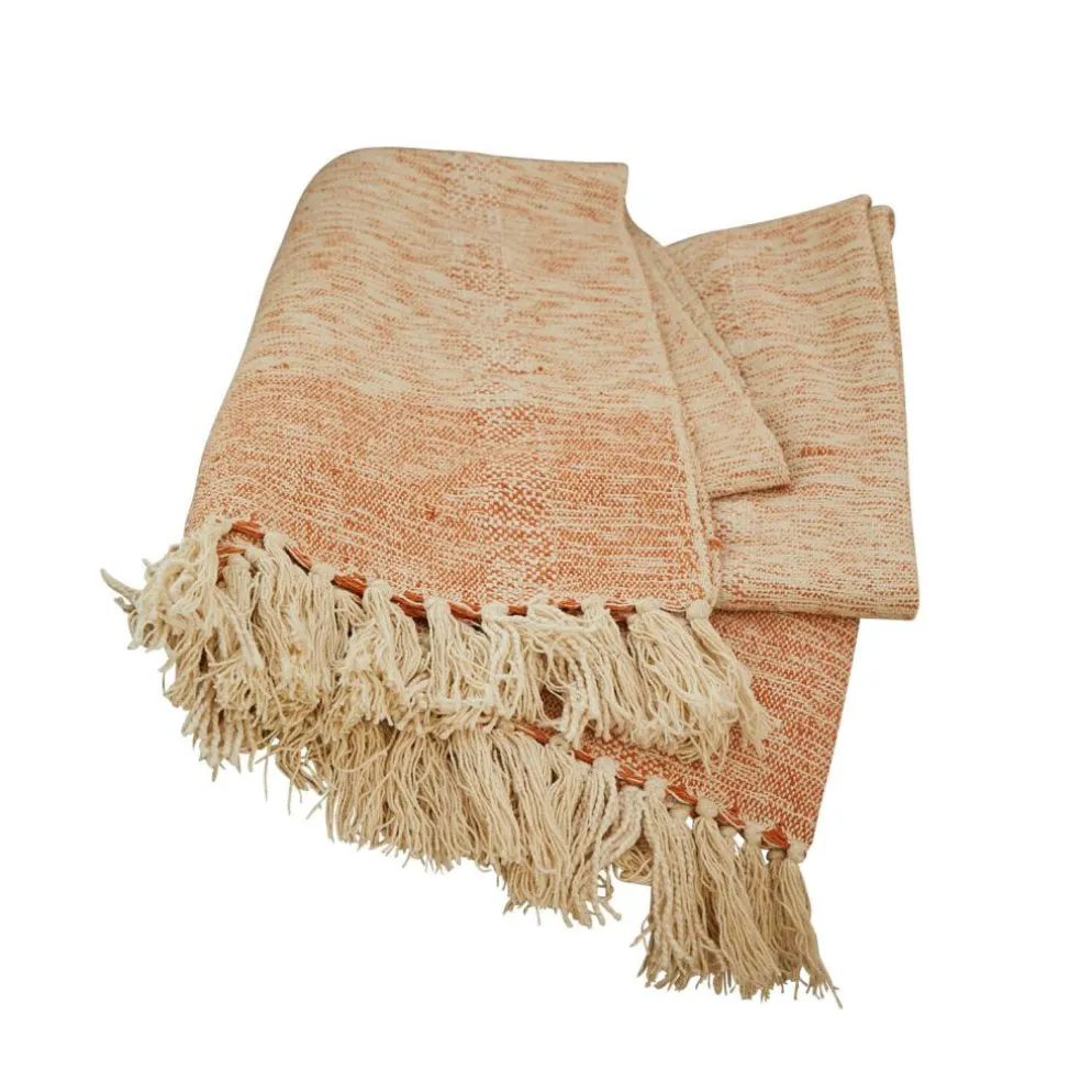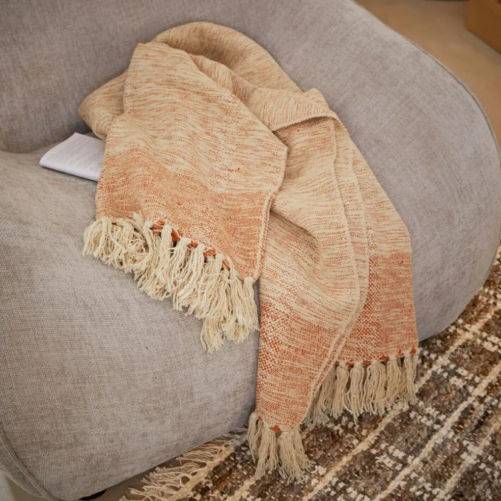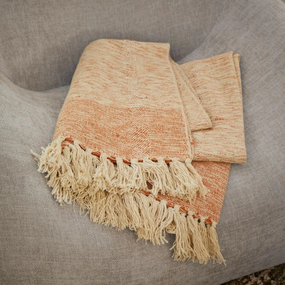 Ce plaid révèle tout son éclat lorsque la lumière douce se pose sur sa surface tissée : voilà un jeu de fines fibres de coton en terre cuite et blanc naturel qui s’intègre comme par magie dans la pièce grâce à sa structure travaillée à la main. Le tissage vivant crée une texture délicate qui n’est pas seulement belle, mais aussi agréable sur la peau. Des franges décoratives dansent aux extrémités courtes, telle une touche bohème qui offre de la légèreté à tout intérieur. Qu’il soit utilisé pour réchauffer le soir ou comme touche décorative sur votre fauteuil préféré, ce plaid dégage une présence chaleureuse et discrète qui invite à la détente.