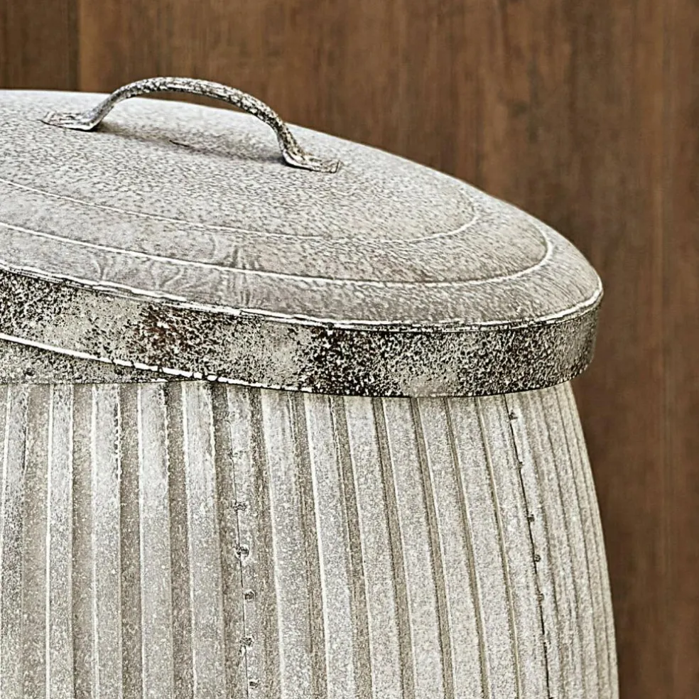 Qui pourrait deviner que ce beau récipient en métal est en réalité une poubelle ? En métal travaillé à la main, elle se distingue par sa structure striée verticale et sa finition vieillie, ce qui lui confère un style shabby chic très tendance. Elle est confectionnée à la main et comprend un couvercle avec une poignée permettant de l’ouvrir facilement. Cette poubelle est aussi pratique que décorative. Elle s’intègre parfaitement à une ambiance vintage.