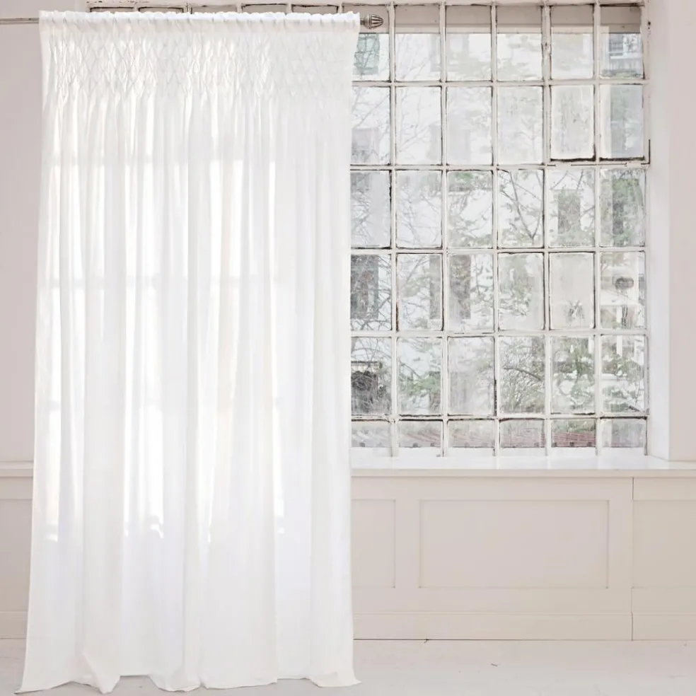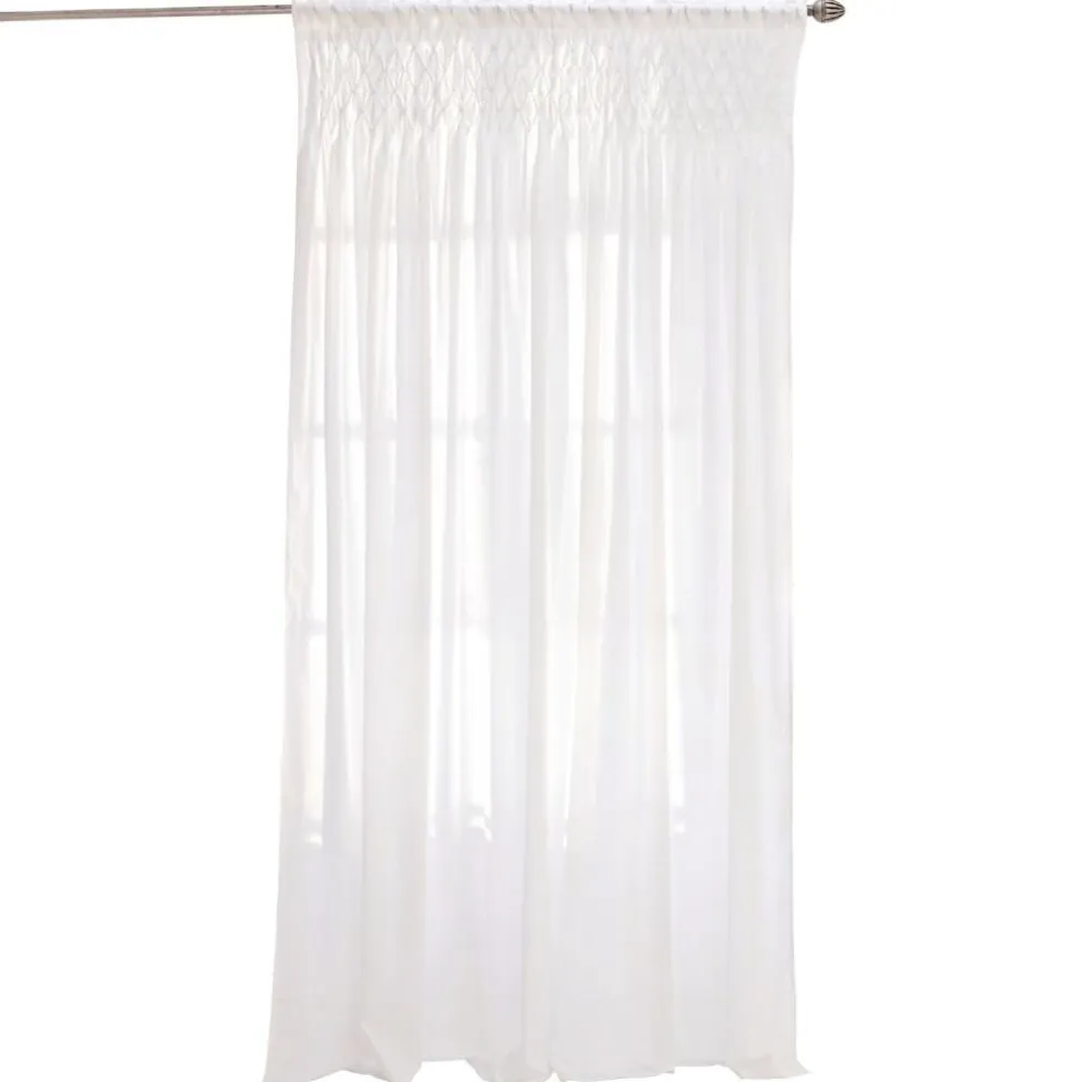 Le haut est souligné d’un large empiècement joliment smocké qui garantit au rideau un tombé voluptueux. Le passant tunnel surpiqué en haut du rideau permet de glisser la tringle facilement.