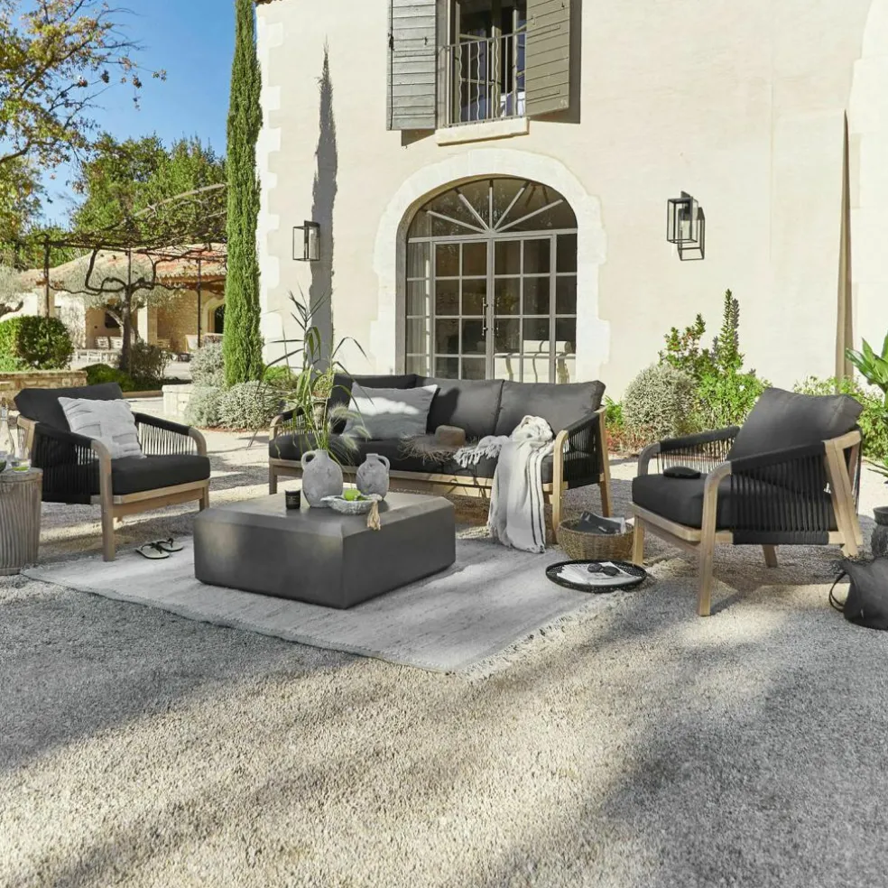 Profitez pleinement de l’été et passez de vrais moments de convivialité à l’extérieur grâce à ce salon de jardin élégant et moderne. Le canapé ainsi que les deux fauteuils sont en bois d’acacia haut de gamme certifié FSC, un matériau de choix pour les meubles de jardin de par sa robustesse et sa longue durée de vie. Son revêtement effet corde sur le dossier et les accoudoirs lui confère un style très tendance. Les coussins d’assise et de dossier fournis sont très confortables. Amovibles, résistantes aux intempéries et lavables, les housses des coussins en fibres d’oléfine sont particulièrement élégantes grâce à leur effet chiné. Il ne vous reste plus qu’à choisir entre deux coloris très attrayants. Vous pouvez également compléter votre salon de jardin avec notre canapé réf. 23115 et notre fauteuil réf. 23121.