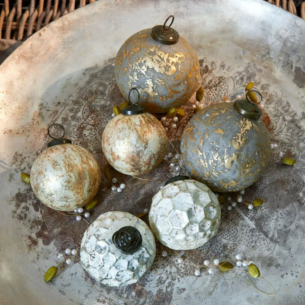 Six boules aux motifs différents témoignent d’un jeu de textures et de la lumière : deux sont recouvertes de veines dorées sur un gris fumé, deux rayonnent d’un look vintage crème délicatement moucheté, et deux présentent un aspect en relief façon pierre avec une surface pleine de caractère. Malgré leur diversité, les boules donnent l’impression d’avoir été créées d’un seul tenant , elles s’accordent harmonieusement les unes aux autres, avec une touche de noblesse, presque digne d’un musée. Elles apportent de la profondeur aux branches de sapin vertes, brillent discrètement à la lumière des bougies et s’intègrent facilement dans les intérieurs de Noël modernes et classiques. Un ensemble pour les amateurs de détails fins et d’élégance subtile.