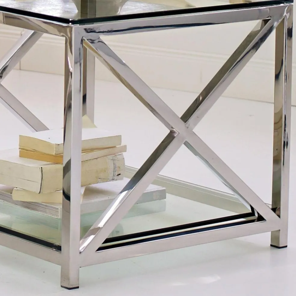 En verre et inox. Le style sobre, transparent et élégant de cette table d’appoint est intemporel. Deux plaques en verre robuste sont maintenues par une structure en métal à la finition argentée dont les croisillons renforcent le caractère classique. Vous pouvez l’utiliser comme table basse devant un canapé sobre en cuir ou en matière textile, ou par paire comme table d’appoint pour apporter une touche très personnelle à votre intérieur.