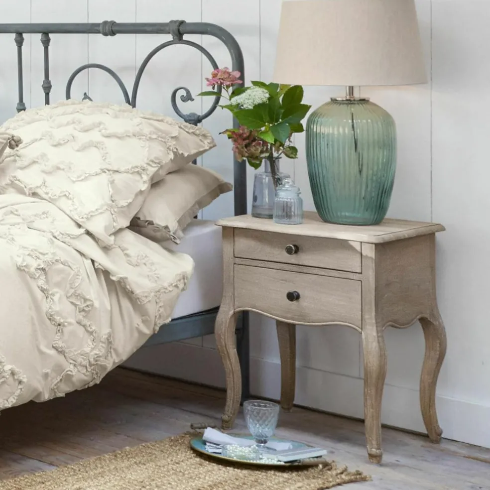 Un vrai petit bijou à l’utilisation très polyvalente. Idéale à côté du lit, vous en ferez également un élégant rangement pour le salon ! En bois de manguier massif, sa conception artisanale de qualité est rehaussée d’une discrète finition blanchie. On ne se sent vraiment à l’aise dans son intérieur que lorsque tous les éléments d’ameublement forment un ensemble harmonieux. Cela est valable aussi bien pour la chambre à coucher que pour le séjour. Si, en outre, les mêmes critères rigoureux en matière d’esthétique et de qualité s’appliquent autant aux petites choses qu’aux objets plus imposants, vos meubles auront vraiment du caractère ! Cette table de chevet fait, sans conteste, partie de ce type de mobilier. Dans le style traditionnel, en bois noble de manguier avec une patine cérusée et rehaussée de beaux détails, elle complète à la perfection tous les lits au style maison de campagne classique. Le plateau de ce meuble élégant pourra accueillir une lampe de chevet, un réveil et un livre, tandis que vous rangerez dans ses deux tiroirs tout ce qui ne doit pas traîner dans la chambre. Cette table de chevet contribue non seulement à créer une atmosphère agréable dans votre chambre à coucher, mais elle sera également du plus bel effet dans votre salon comme jolie table d’appoint. Grâce à sa faible profondeur, elle prendra peu de place à côté du canapé, dans le coin d’une pièce ou même dans l’entrée.
